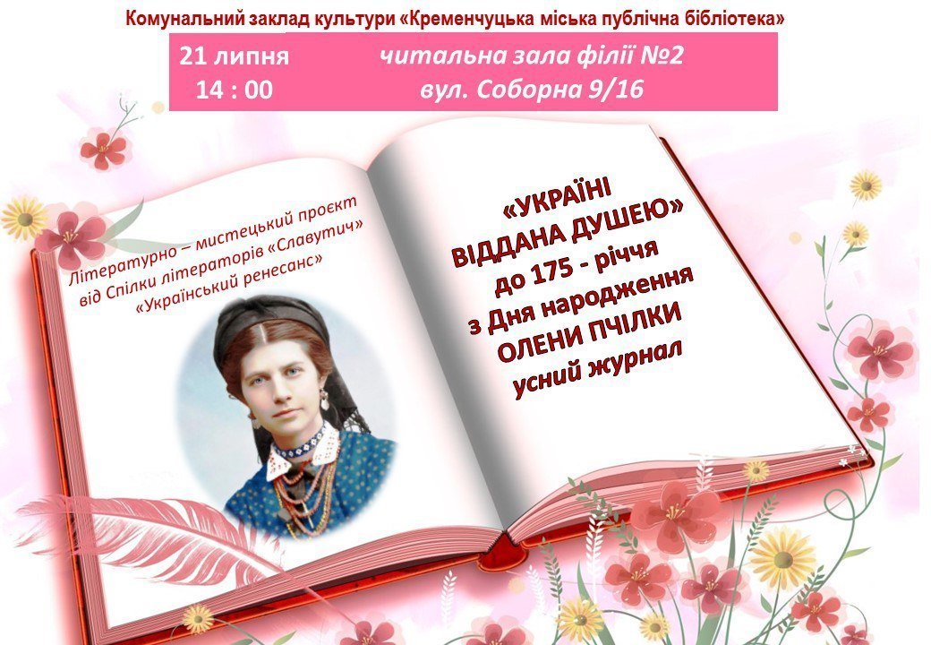 У кременчуцькій бібліотеці організовують захід «Україні віддана душею» до 175-річчя з дня народження письменниці Олени Пчілки. Про це повідомили на телеграм-каналі Кременчуцької міської ради.