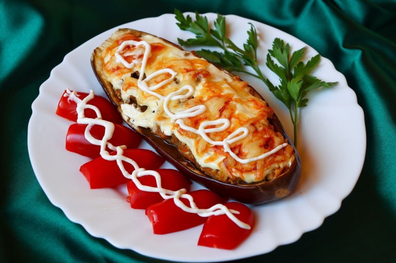 У баклажанів відріжте плодоніжки й розріжте овочі вздовж, щоб вийшли «човники». Шкірку не знімайте — вона збереже форму овочів та вигляд страви.