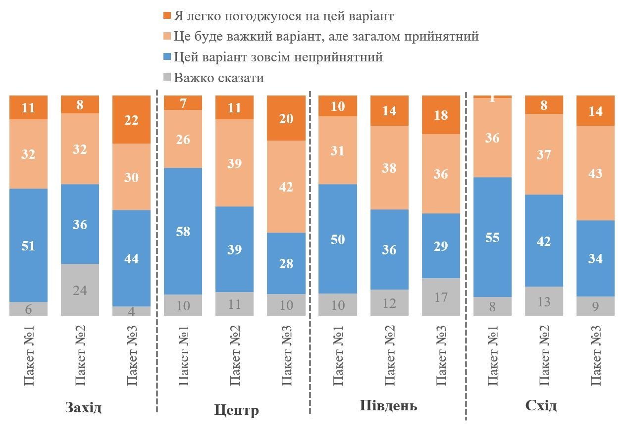На графіку нижче наведені результати для кожного пакету. Як можна побачити, варіант з відкладенням визволення окупованих зараз територій та забороною на вступ до НАТО, проте із вступом до ЄС (пакет №1), підтримують 38%, а для 54% такий варіант категорично неприйнятний.