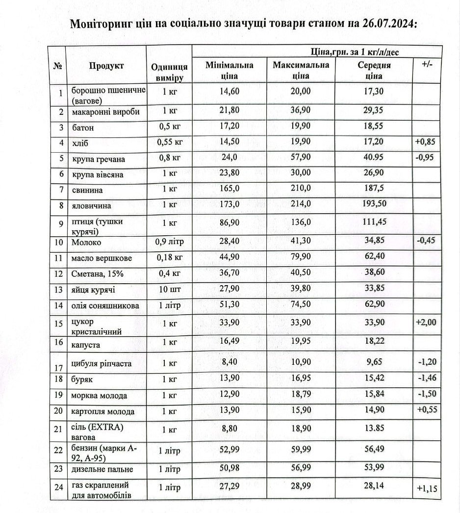 Кременчуцьке районне управління Держпродспоживслужби провело моніторинг цін на соціально значущі товари у торговельних закладах району станом на 26 липня. З цією інформацією наше видання ознайомила Кременчуцька районна військова адміністрація.