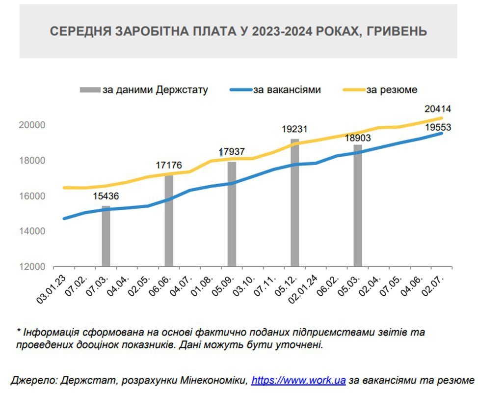 Згідно з аналізом відомства, середня зарплата за вакансіями на сайтах пошуку роботи у липні 2024 року зросла до 19 553 грн.