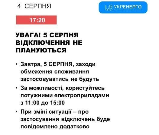 У понеділок, 5 серпня, заходи обмеження споживання електроенергії застосовувати не будуть.