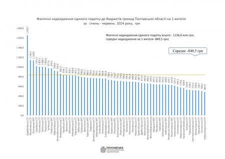 Загальні надходження єдиного податку до бюджетів громад у першому півріччі склали понад 1,1 мільйонів гривень. За словами голоси Полтавської ОВА Філіпа Проніна, таке значення на 4% перевищує планові показники і на 9% більше у порівнянні із аналогічним періодом у минулому році.