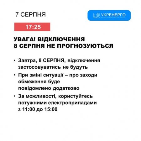 У четвер, 8 серпня, відключень електроенергії не планують.