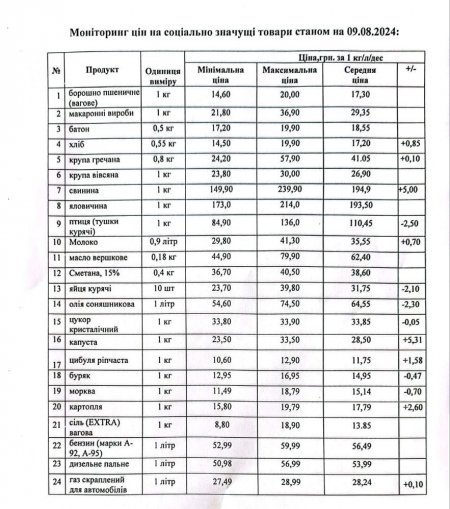 Кременчуцьке районне управління Держпродспоживслужби провело моніторинг цін на соціально значущі товари у торговельних закладах району станом на 9 серпня. З цією інформацією наше видання ознайомила Кременчуцька районна військова адміністрація.