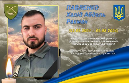 Стало відомо про загибель 23-річного молодшого сержанта, командира взводу штурмової роти ОШБ ЗСУ Павленка Халіда Абдель Рахмана. Як повідомила Ірина Васильєва, Халід Павленко був випускником Кременчуцького ліцею з посиленою військово-фізичною підготовкою 2018 року.