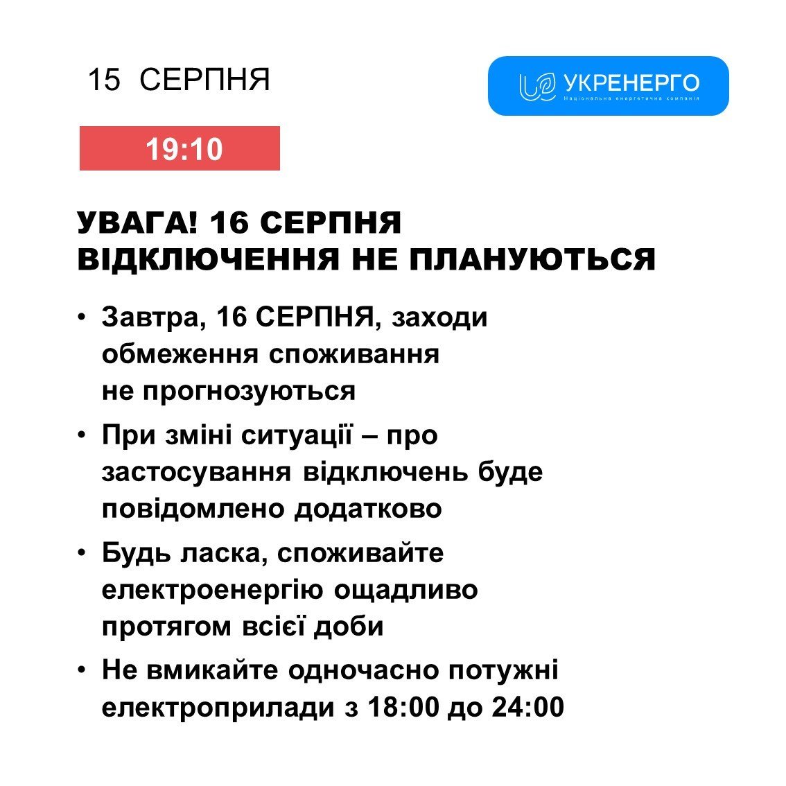 Завтра, 16 серпня, відключень електроенергії в Україні не плануються.