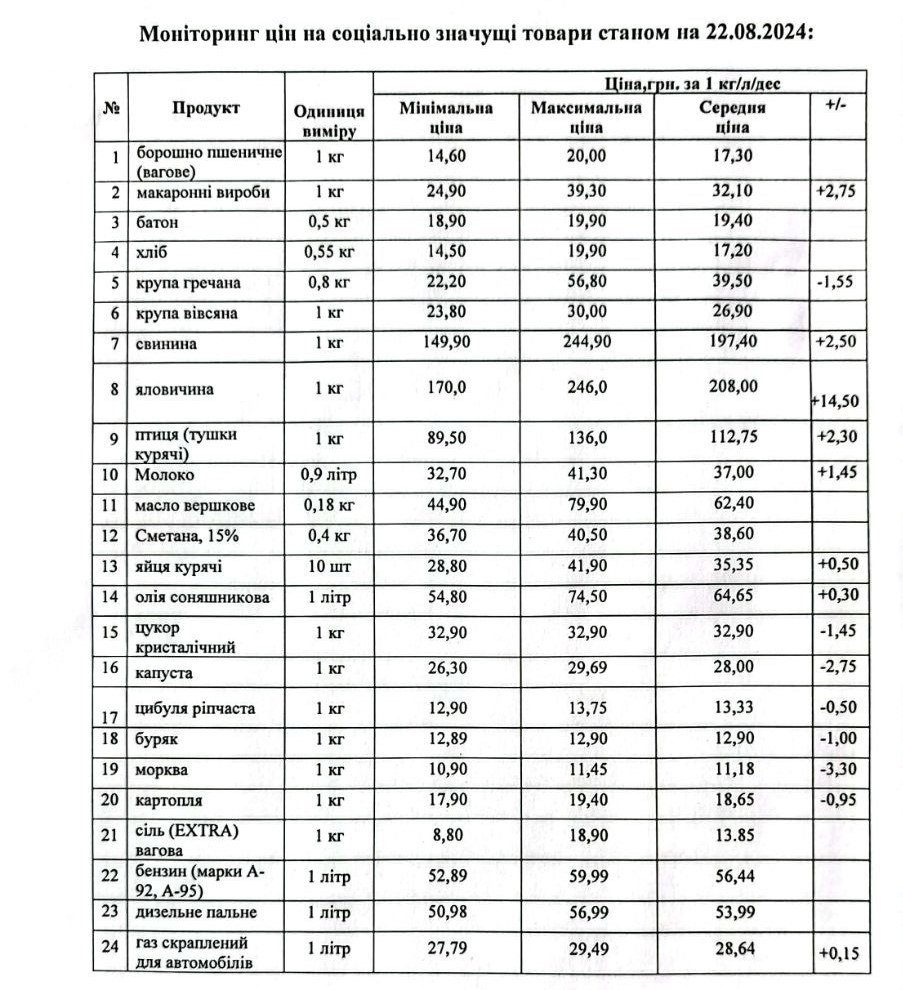 Кременчуцьке районне управління Держпродспоживслужби провело моніторинг цін на соціально значущі товари у торговельних закладах району станом на 22 серпня. З цією інформацією наше видання ознайомила Кременчуцька районна військова адміністрація.