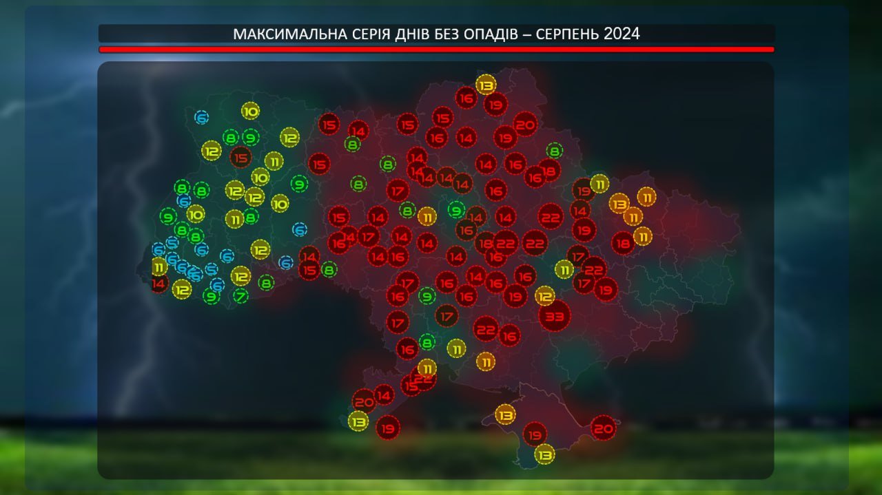 Востаннє дощ на Полтавщині фіксували 4 серпня. Наразі серія без опадів триває уже 22 дні. Найдовший період без дощів метеорологи зафіксували у Нікополі на Дніпропетровщині — там востаннє опади були 23 липня.
