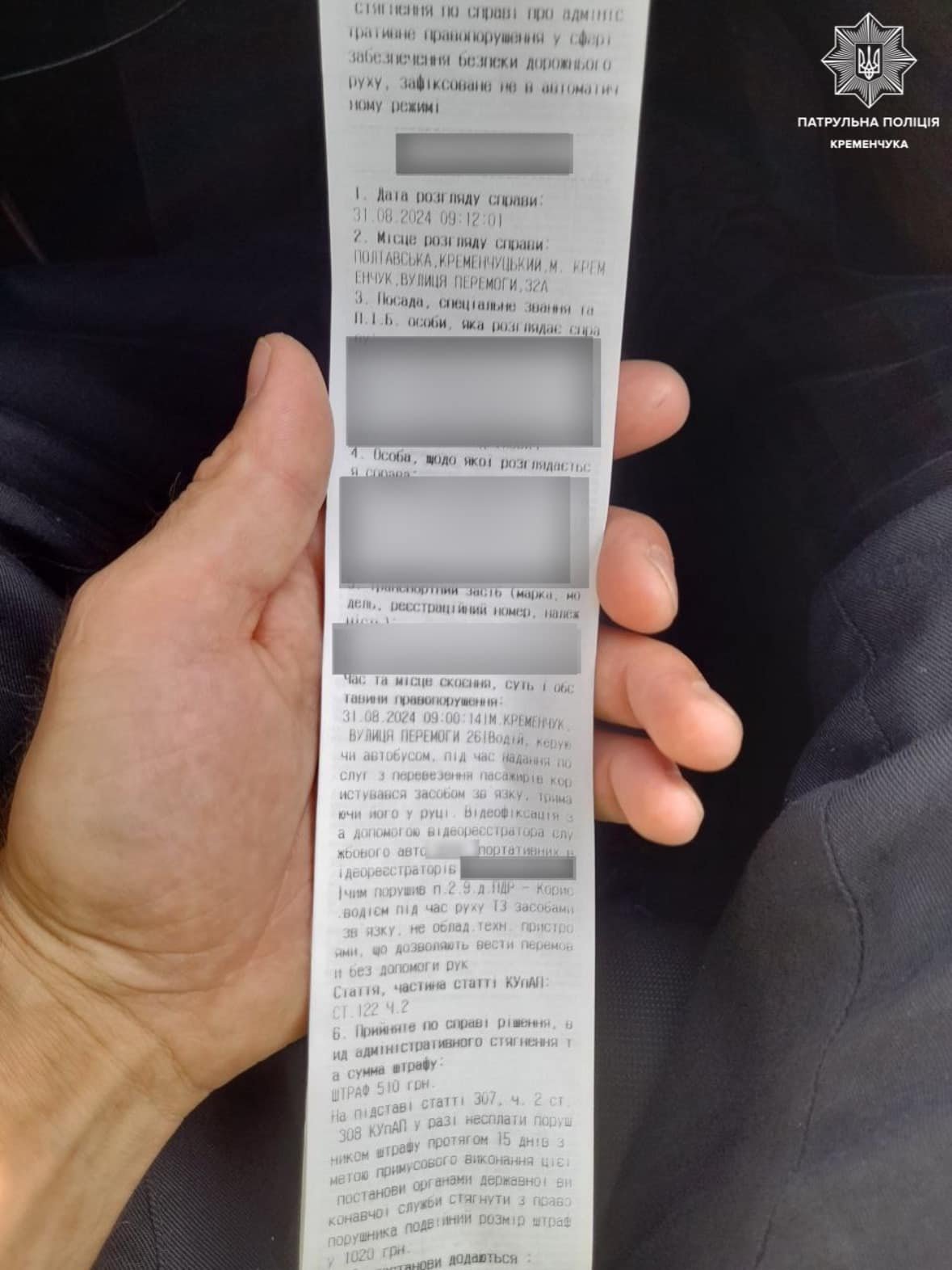Сьогодні на вулиці Перемоги у Кременчуці патруль поліції зупинив водія маршрутного транспортного засобу, який під час перевезення пасажирів розмовляв по телефону, тримаючи його в руках.