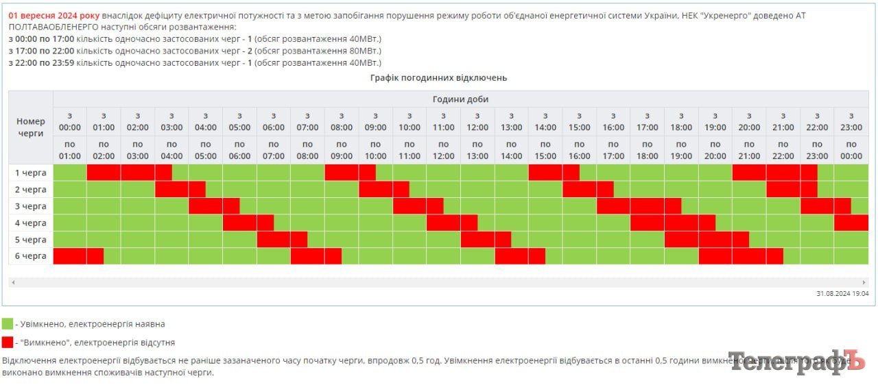 У неділю, 1 вересня, у Кременчуці та на Полтавщині протягом усього дня діятимуть графіки погодинного відключення світла