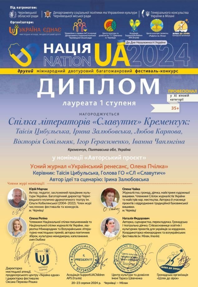 Кременчуцька спілка літераторів «Славутич» взяла участь у другому міжнародному дистанційному багатожанровому мистецькому фестивалі-конкурсі «Нація UA» — 2024. Талановиті спілчани представляли на розгляд журі авторський проєкт — Усний журнал «Український ренесанс, Олена Пчілка» й зайняли перше місце.