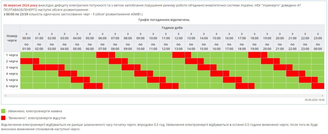 У п’ятницю, 6 вересня, у Кременчуці та на Полтавщині графік погодинного відключення світла буде діятиме протягом усієї доби.