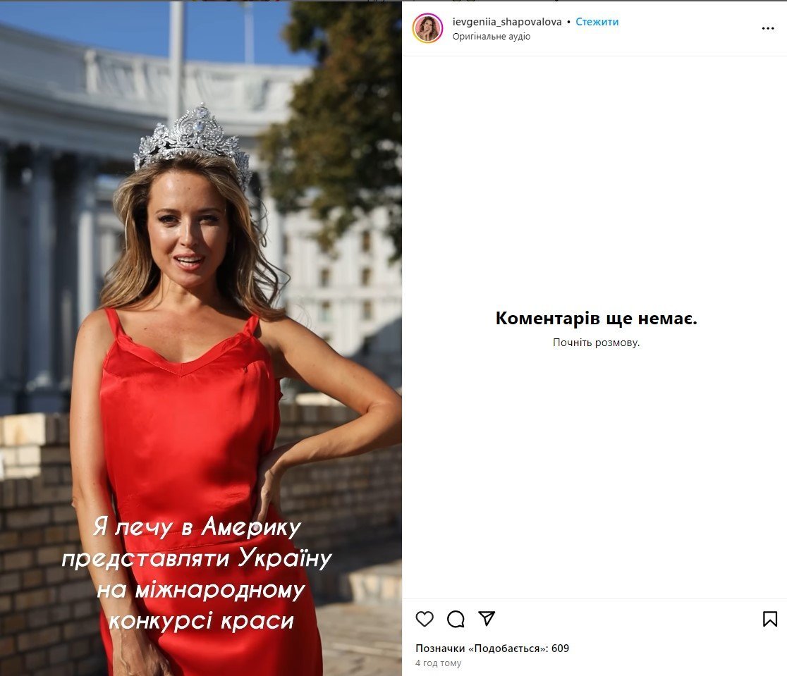 19 вересня на своїй сторінці в інстаграм дружина кременчуцького нардепа Юрія Шаповалова Євгенія виклала відео, в якому повідомила, що летить в Америку, представляти Україну на міжнародному конкурсі краси.