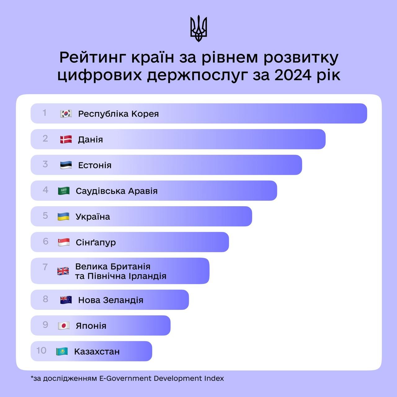 Цей рейтинг оцінює 193 країни світу та розробляється ООН. Його лідером стала Південна Корея, Данія посіла друге місце, а Естонія — третє. Україна опинилася на пʼятому місці після Саудівської Аравії.