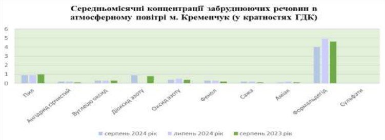 Проте у порівнянні з липнем 2024 року та серпнем 2023 року кількість забруднювачів у повітрі Кременчука знизилася.