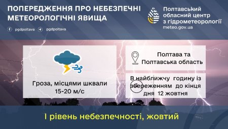 Сьогодні, 12 жовтня, упродовж доби синоптики попереджають про грози, місцями зі шквалами. Інформують про погоду у пресслужбі Полтавського обласного гідрометцентру.