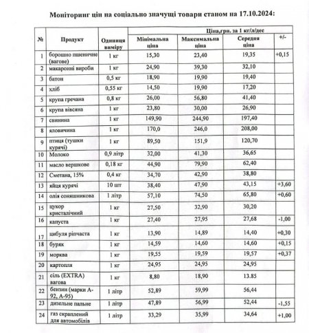 Кременчуцьке районне управління Держпродспоживслужби провело моніторинг цін на соціально значущі товари у торгівельних закладах району станом на 17 жовтня. З цією інформацією наше видання ознайомила Кременчуцька районна військова адміністрація.