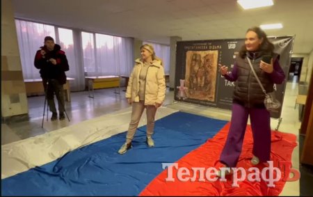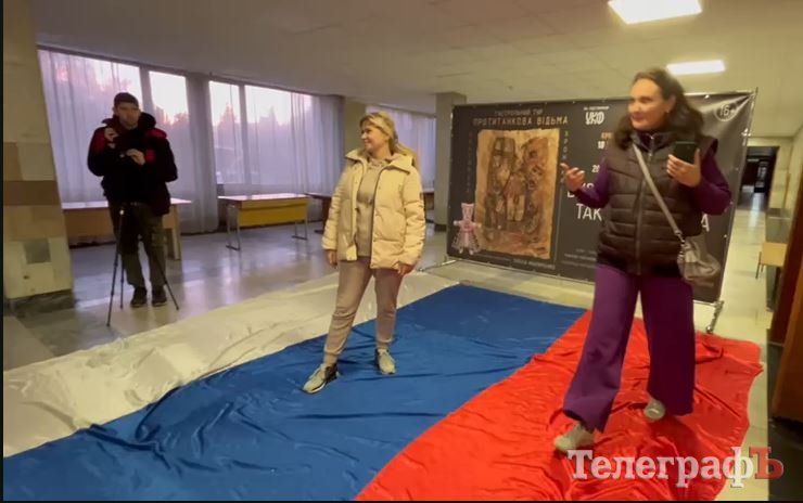 Але перше, на що звернули увагу журналісти й глядачі, що прийшли на спектакль, це величезний російський прапор, який лежав на підлозі перед входом в залу, й по якому топталися люди.
