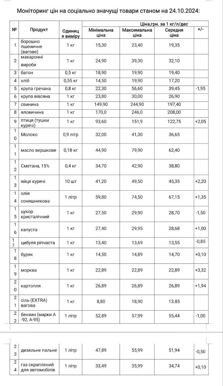 Кременчуцьке районне управління Держпродспоживслужби провело моніторинг цін на соціально значущі товари у торгівельних закладах району станом на 24 жовтня. З цією інформацією наше видання ознайомила Кременчуцька районна військова адміністрація.