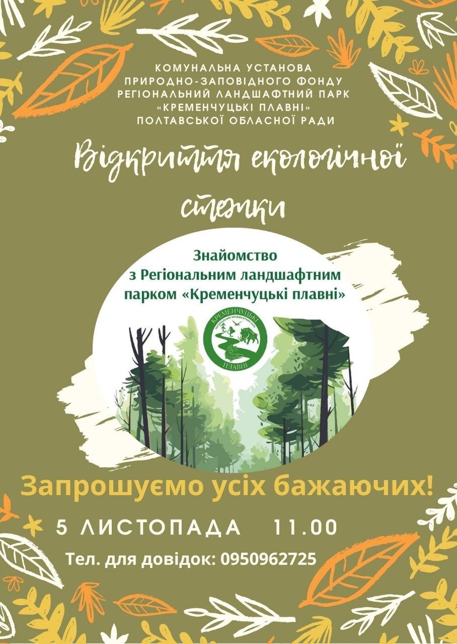 Завтра у Кременчуці відбудеться відкриття першої у громаді екологічної стежки. Знаходиться вона на базі РЛП «Кременчуцькі плавні» і має відповідну назву — «Знайомство з регіональним ландшафтним парком «Кременчуцькі плавні». Про це журналістам «Кременчуцького Телеграфа» повідомили організатори.