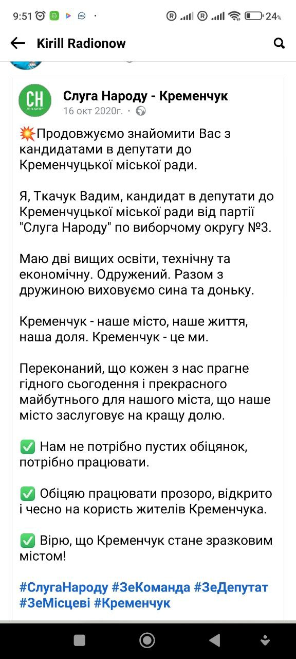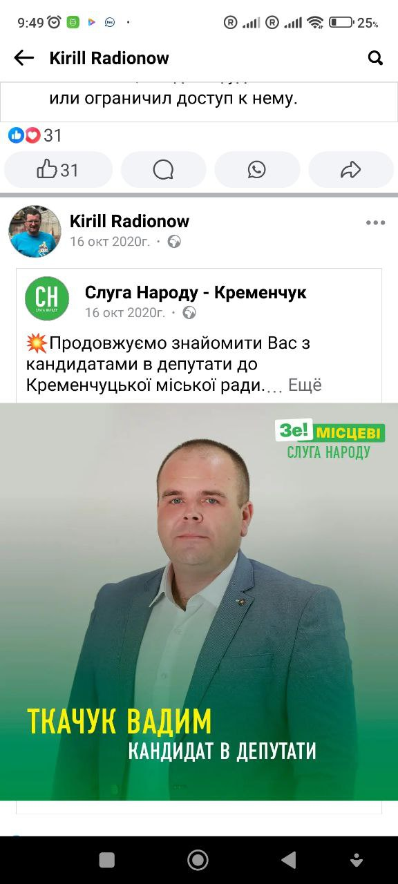 Згадку про кандидата у «Слуги народу» Вадима Ткачука ми зустріли й на сторінці бізнесмена Кирила Радіонова. Публікація за 2020 рік була доступна у відкритому доступі у серпні цього року. Наразі ми вже не бачили цього поста: