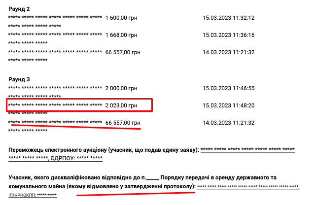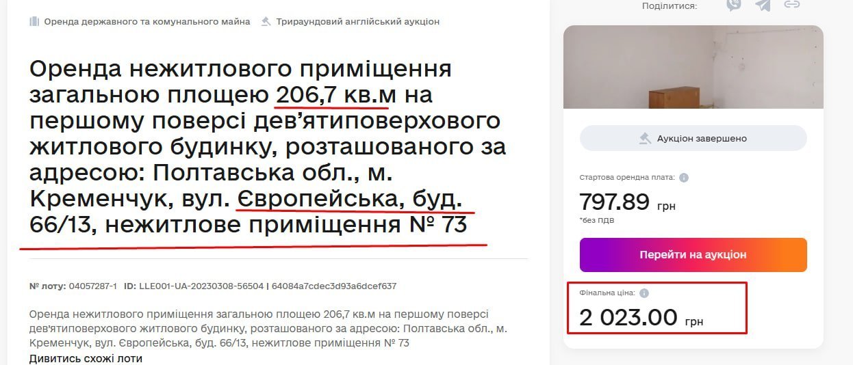 А тепер деталі. Право оренди приміщення виставили на аукціон. Один з учасників запропонував за приміщення 66 тис. грн щомісячної плати, інші два — 2 тис. «з копійками». Площа приміщення — 206 кв. м, це як три трикімнатні квартири. На конкурсі «перемогла» пропозиція 2023 грн орендної плати на місяць. Учасника, що пропонував 66 тис. грн, дискваліфікували, відмовили у затвердженні договору. На жаль, дані учасників аукціонів перестали розкривати — це мотивують питанням безпеки під час війни. Дуже зручно для корупційних схем.