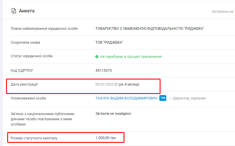 Компанію-переможця «народили» 9 березня 2023 року, конкурс відбувся 15 березня 2023 року. Статутний капітал цієї солідної фірми — тисяча гривень. Основна діяльність — купівля та продаж власного нерухомого майна.