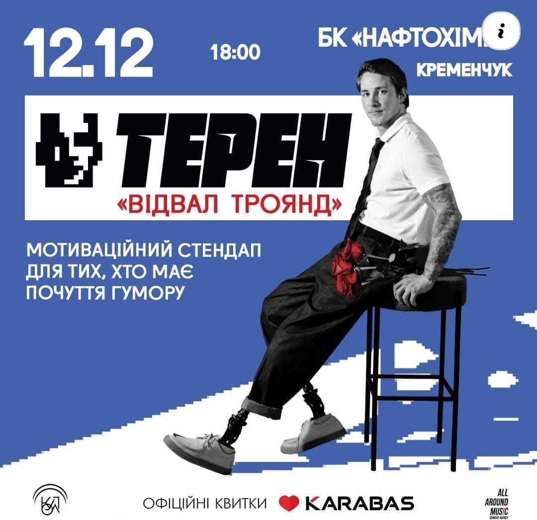 Колишній військовий, ветеран російсько-української війни, письменник, громадський діяч, ведучий шоу «Відвал ніг або All інклюзив» та учасник шоу «Холостяк» Олександр Терен побуває у Кременчуці. Стендап відбудеться 12 грудня, 18.00, БК «Нафтохімік».