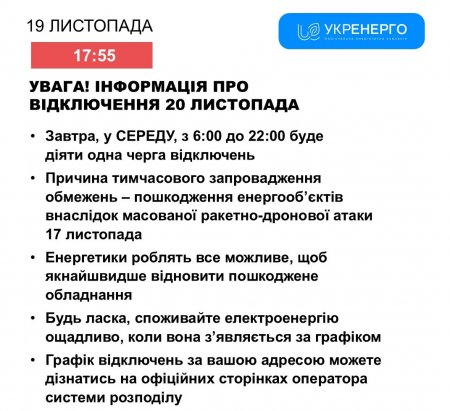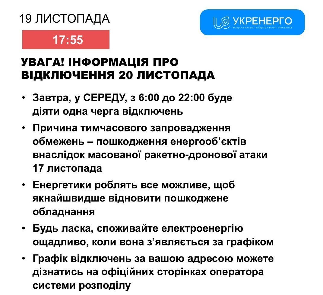 Завтра, 20 листопада, у Кременчуці та на Полтавщині світло споживачам вимикатимуть по одній черзі. Про це повідомили у пресслужбі Національної енергетичної компанії «Укренерго».