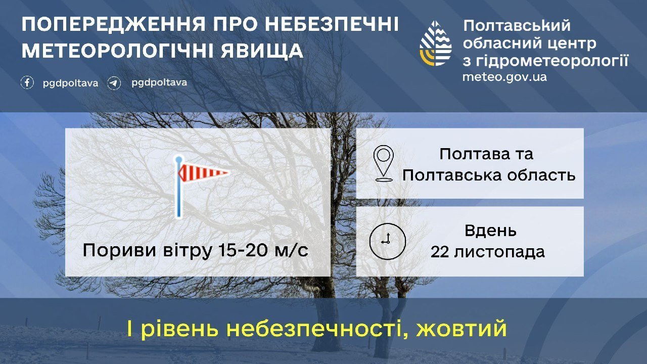 Метеорологи також попереджають, що завтра, 22 листопада, в області очікуються пориви вітру 15-20 м/с.