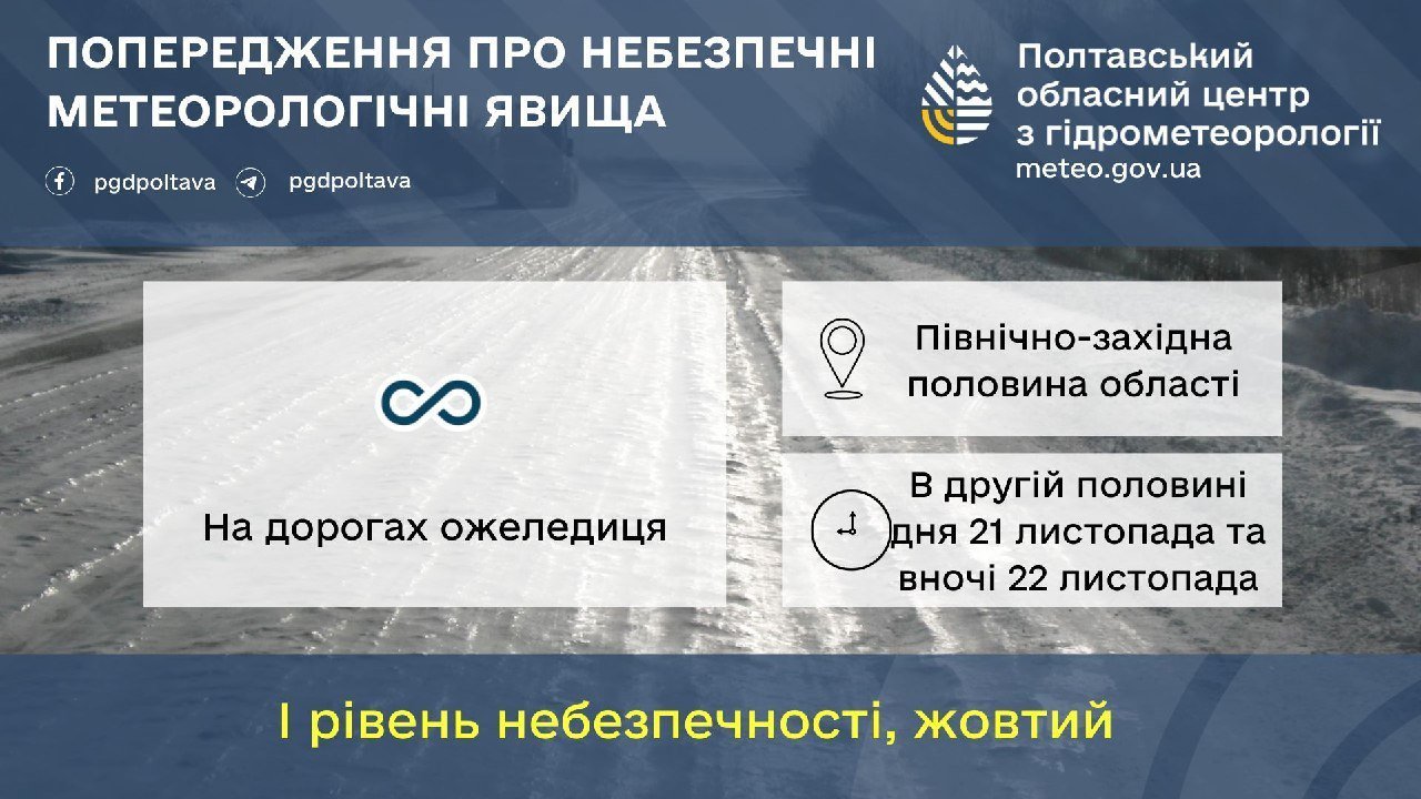 У другій половині дня сьогодні, 21 листопада, та завтра, 22 листопада, на дорогах Кременчука та Полтавщини можлива ожеледиця. Про погіршення погодних умов попереджають синоптики Полтавського обласного гідрометцентру.