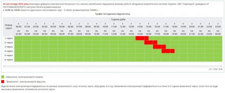 ПАТ «Полтаваобленерго» оприлюднило графік погодинних відключень світла на завтра, 24 листопада.