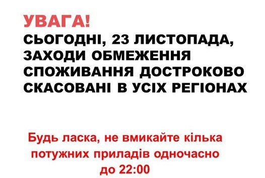 Сьогодні, 23 листопада, графік погодинних відключень скасований до кінця доби в усіх регіонах. Про це повідомила НЕК «Укренерго».