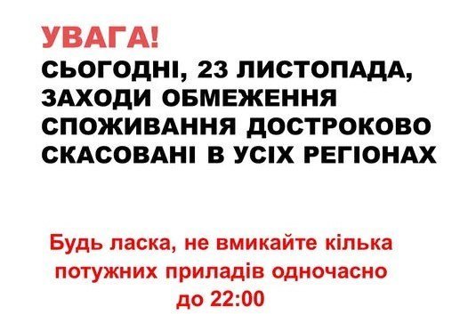 Нагадаємо, в «Укренерго» заявили, що завтра, 24 листопада, відключати електроенергію будуть лише з 14.00 до 18.00.