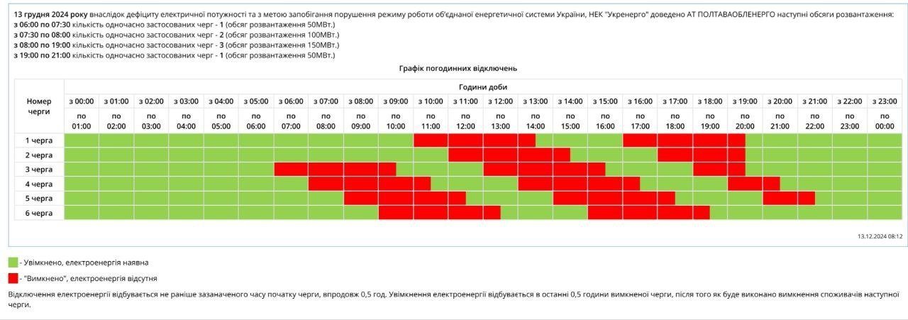 За розпорядженням «Укренерго», 13 грудня відбулися зміни до графіка погодинних відключень, а саме з 8.01 до 19.00 введена додаткова черга. Тобто з 8.01 до 19.00 будуть знеструмлювати 3 черги. Про це повідомила пресслужба Полтаваобленерго.