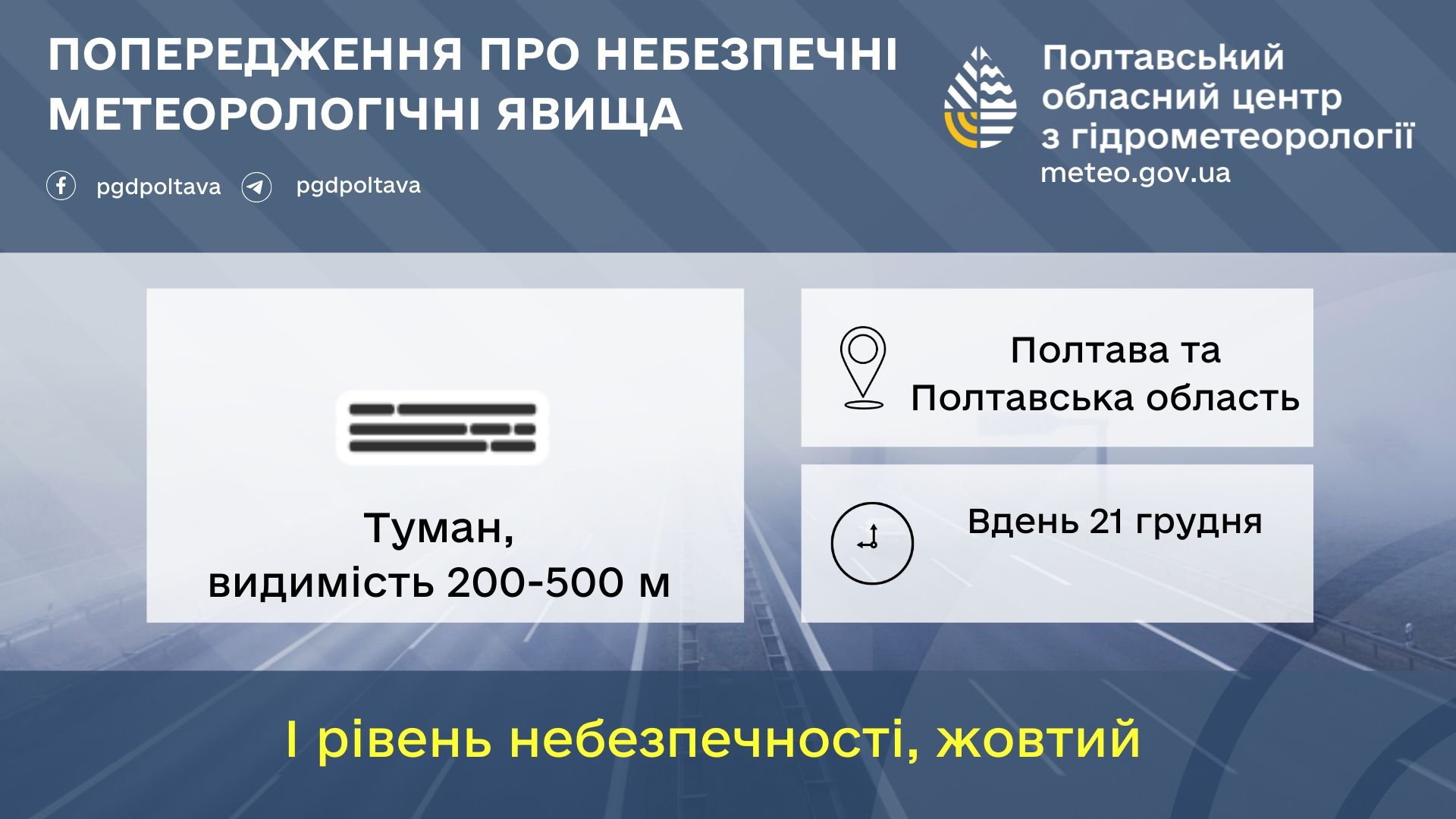 Сьогодні, 21 грудня, у Кременчуці та на Полтавщині синоптики прогнозують туман та низьку видимість на дорогах. Про це інформують у пресслужбі Полтавського обласного центру з гідрометеорології.