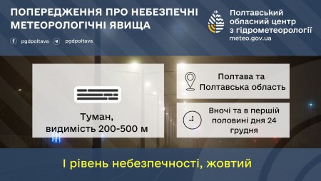 У вівторок, 24 грудня, на Полтавщині синоптики прогнозують туман. Про це інформують у пресслужбі Полтавського обласного гідрометцентру.