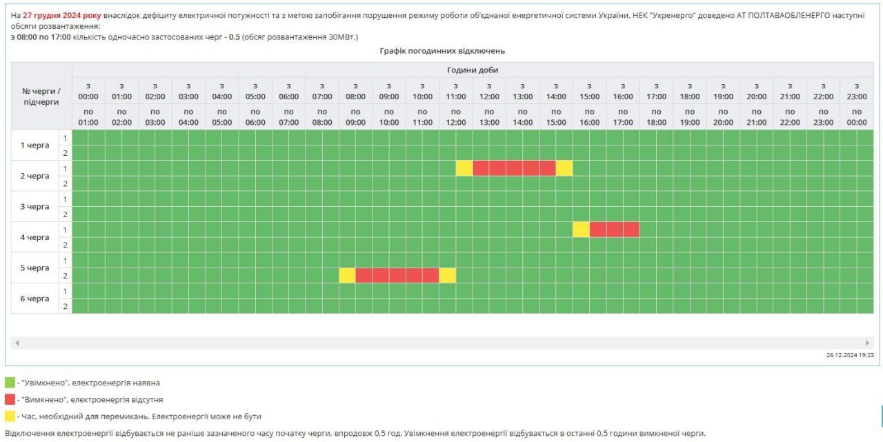 Нагадаємо, графіки погодинного відключення електроенергії на Полтавщині та по всій Україні запровадили внаслідок масованої ракетної атаки по енергетиці 25 грудня.