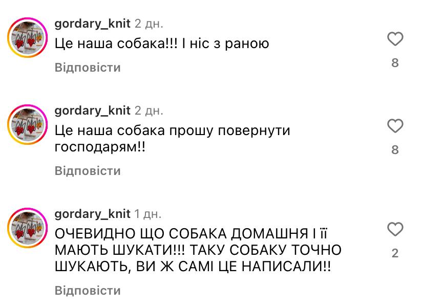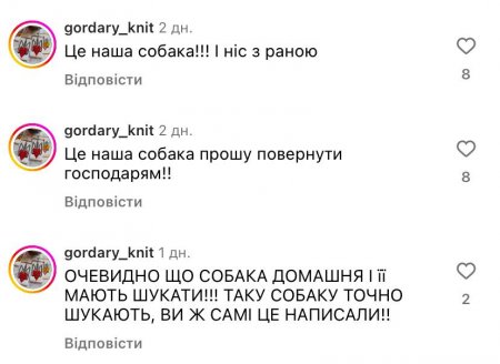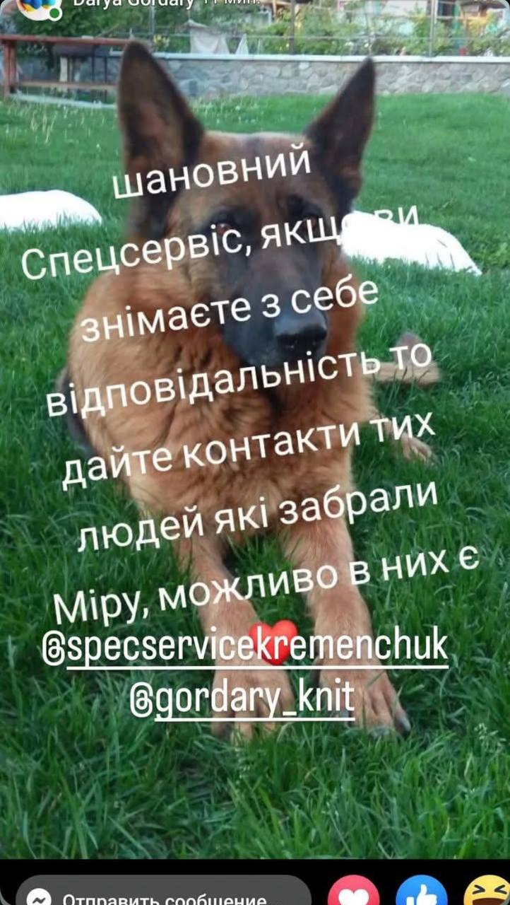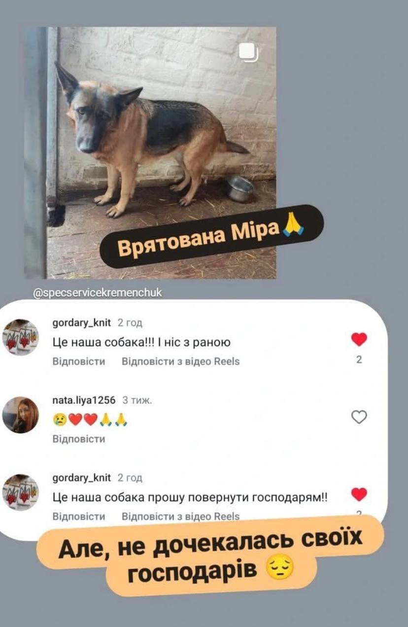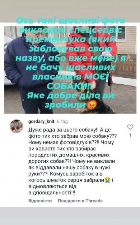 До редакції «Кременчуцького Телеграфа» у соцмережах звернулась читачка, яка поскаржилась, що «Спецсервіс» віддав її собаку іншим господарям і відмовляється повернути тварину чи дати контакти людей, яким її віддали. Жінка обурена ситуацією, що склалася, й пише про це коментарі в інстаграмі. За словами жінки, «Спецсервіс» її заблокував.