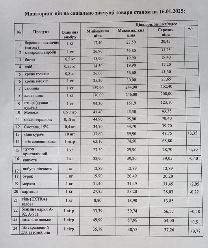 Кременчуцьке районне управління Держпродспоживслужби провело моніторинг цін на соціально значущі товари у торгівельних закладах району станом на 16 січня. З цією інформацією наше видання ознайомила Кременчуцька районна військова адміністрація.