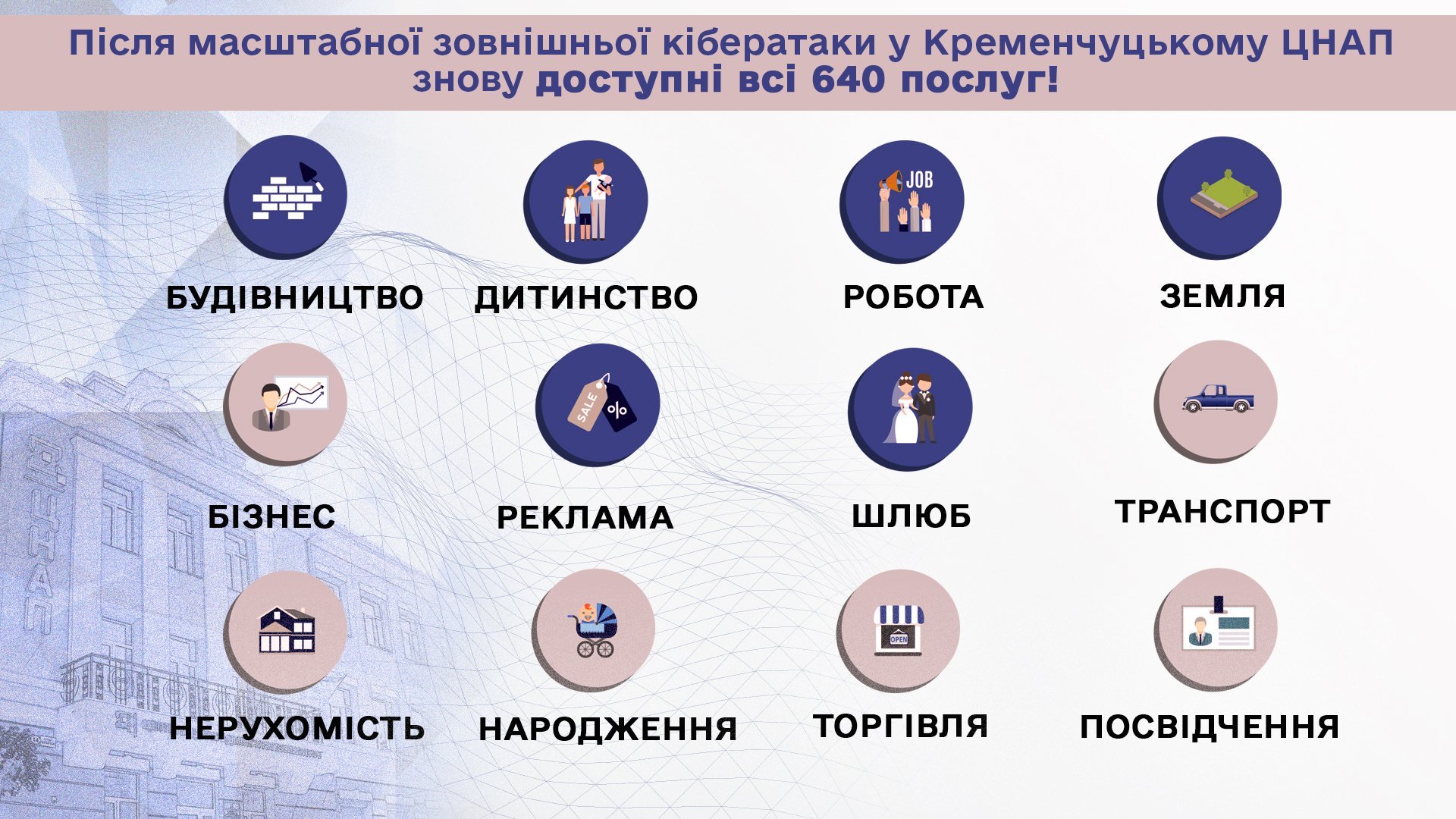 Після масштабної кібератаки з боку Росії у Кременчуцькому ЦНАПі відновили надання усіх 640 послуг. Замовляти та отримувати послуги, а також користуватися сервісами тепер можна, як і раніше. Про це повідомила пресслужба Кременчуцької міської ради.