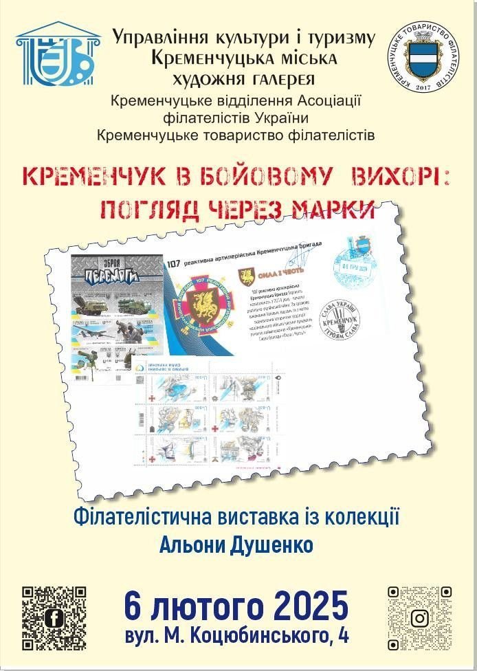 Виставка «Кременчук у бойовому вихорі» з колекції Альони Душенко відкриває воєнні події через філателію. Кожен експонат розповідає про боротьбу, стійкість і незламний дух.