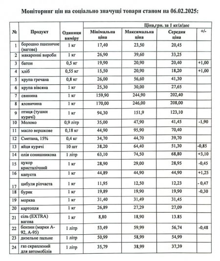 Кременчуцьке районне управління Держпродспоживслужби провело моніторинг цін на соціально значущі товари у торгівельних закладах району станом на 6 лютого. З цією інформацією наше видання ознайомила Кременчуцька районна військова адміністрація.