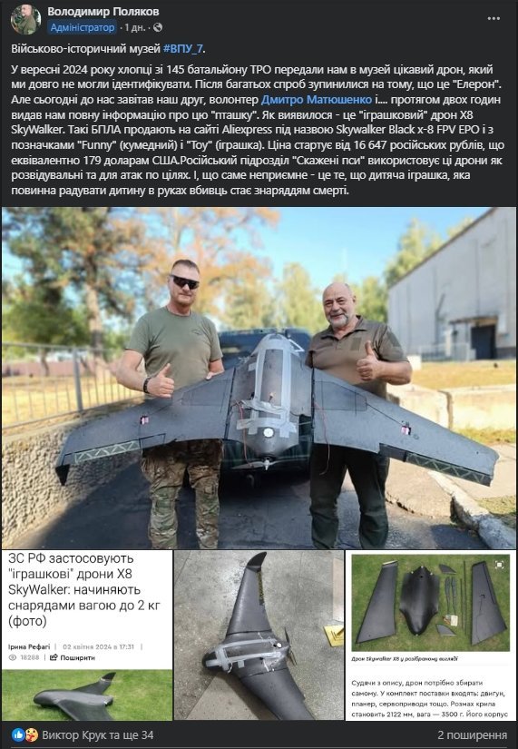 Також у вересні 2024 року 145-й батальйон ТРО передав до музею невідомий дрон, який тривалий час не могли ідентифікувати. Зрештою вдалося встановити, що це X8 SkyWalker — дрон, який продається на Aliexpress як «іграшковий» (ціна стартує від 179 доларів США). Російські війська використовують його для розвідки та атак.