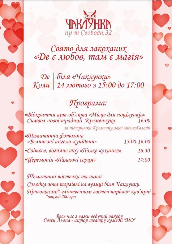 Свято відбудеться біля магічної кав’ярні «Чаклунка» 14 лютого з 15 до 17 години .
