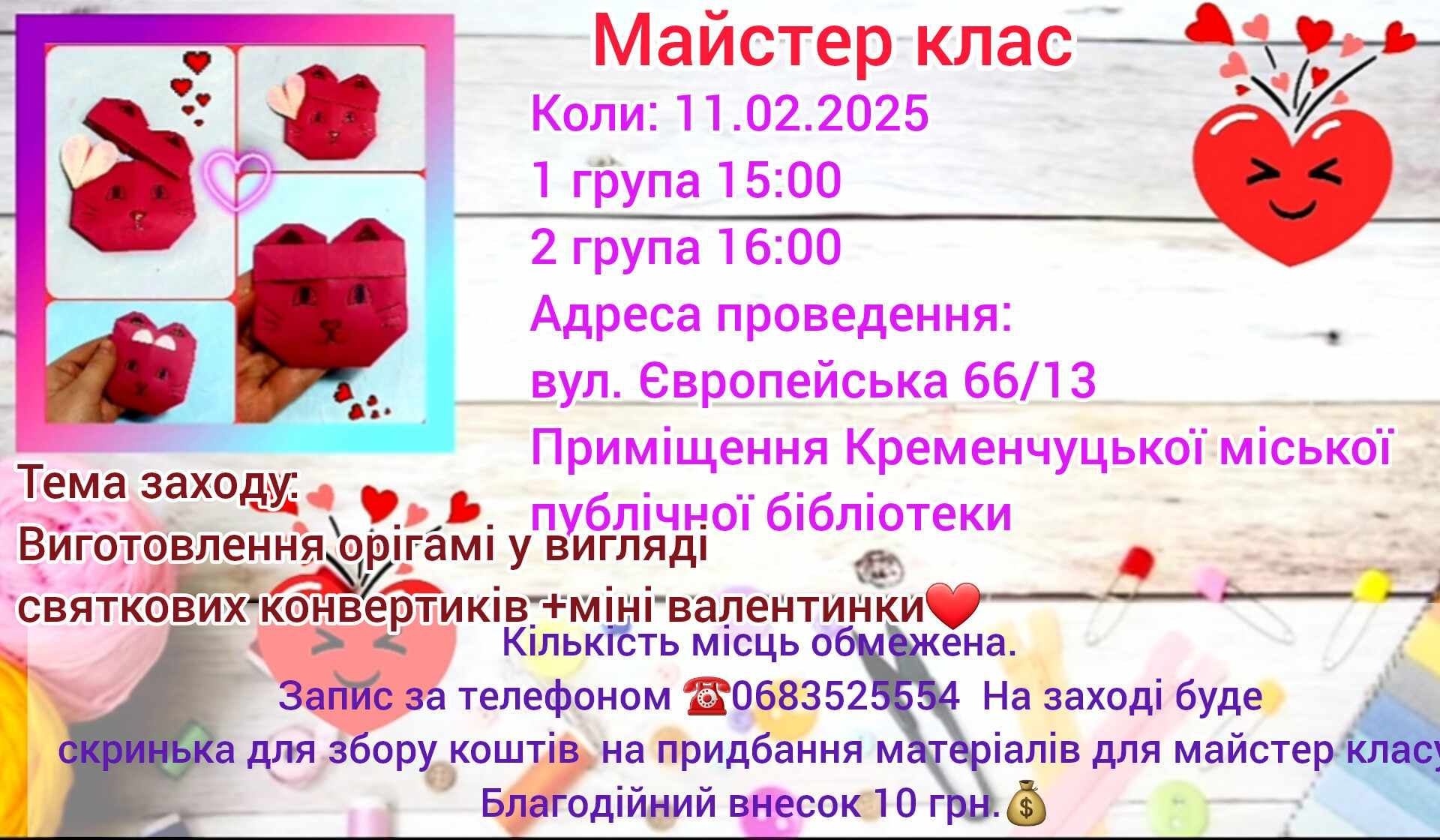 Відбудеться майстер-клас завтра, 11 лютого, о 15.00 та 16.00 у приміщенні бібліотеки за адресою вул. Європейська, 66/13.