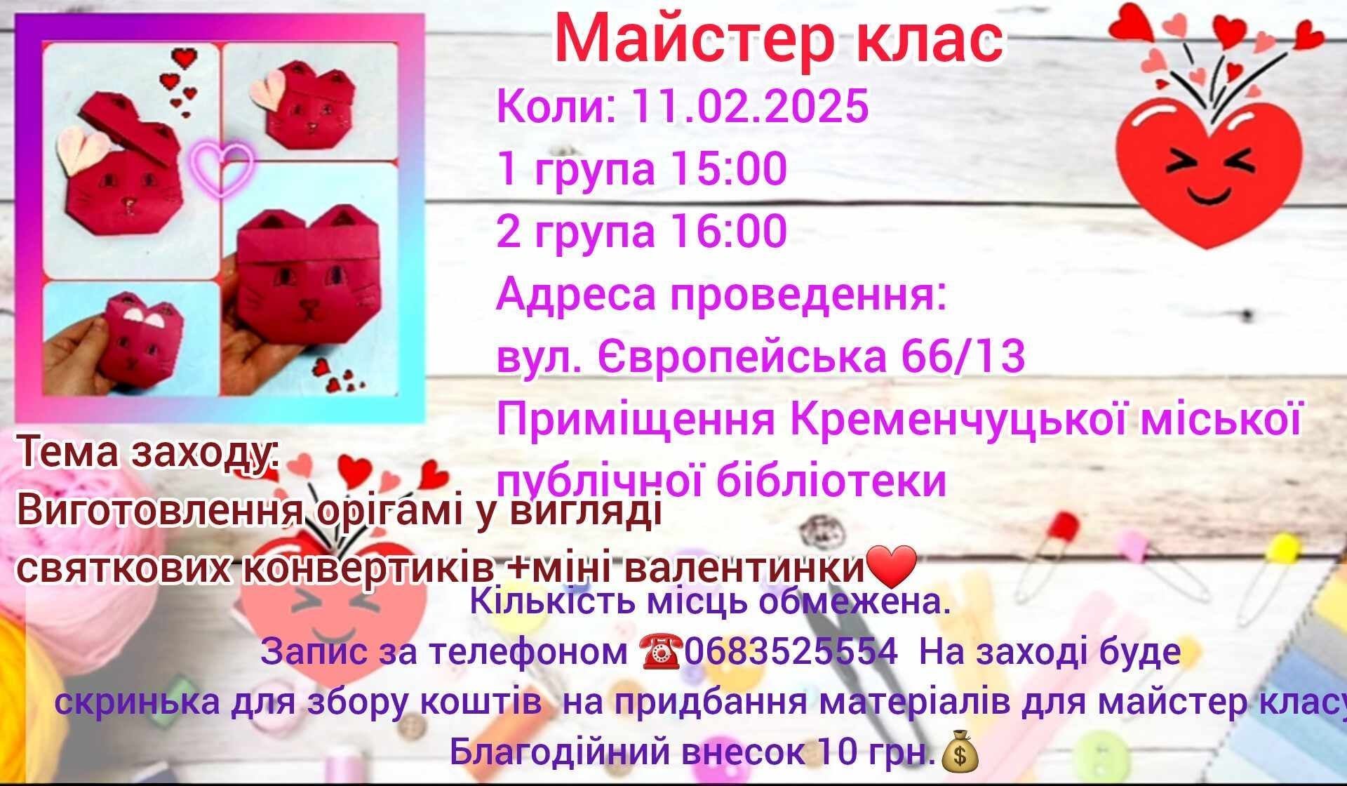 Кременчуцьких дітлахів разом з батьками запрошують до бібліотеки на майстер-клас з виготовлення невеликих валентинок та святкових конвертів у техніці оригамі. Про проведення заходу журналістам «Кременчуцького Телеграфа» повідомили організатори.