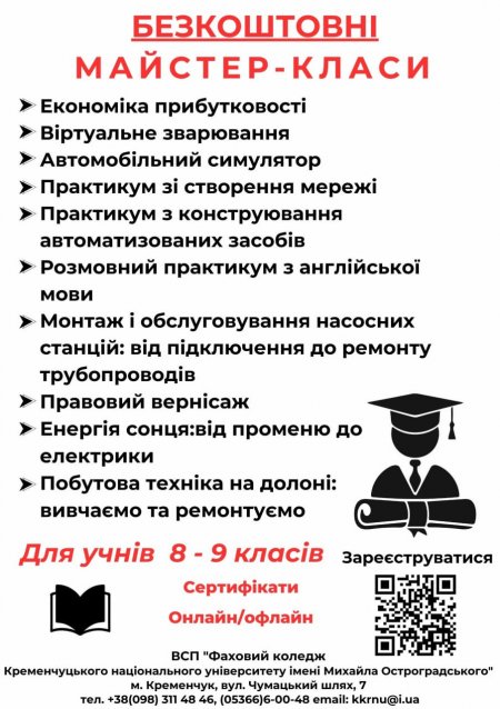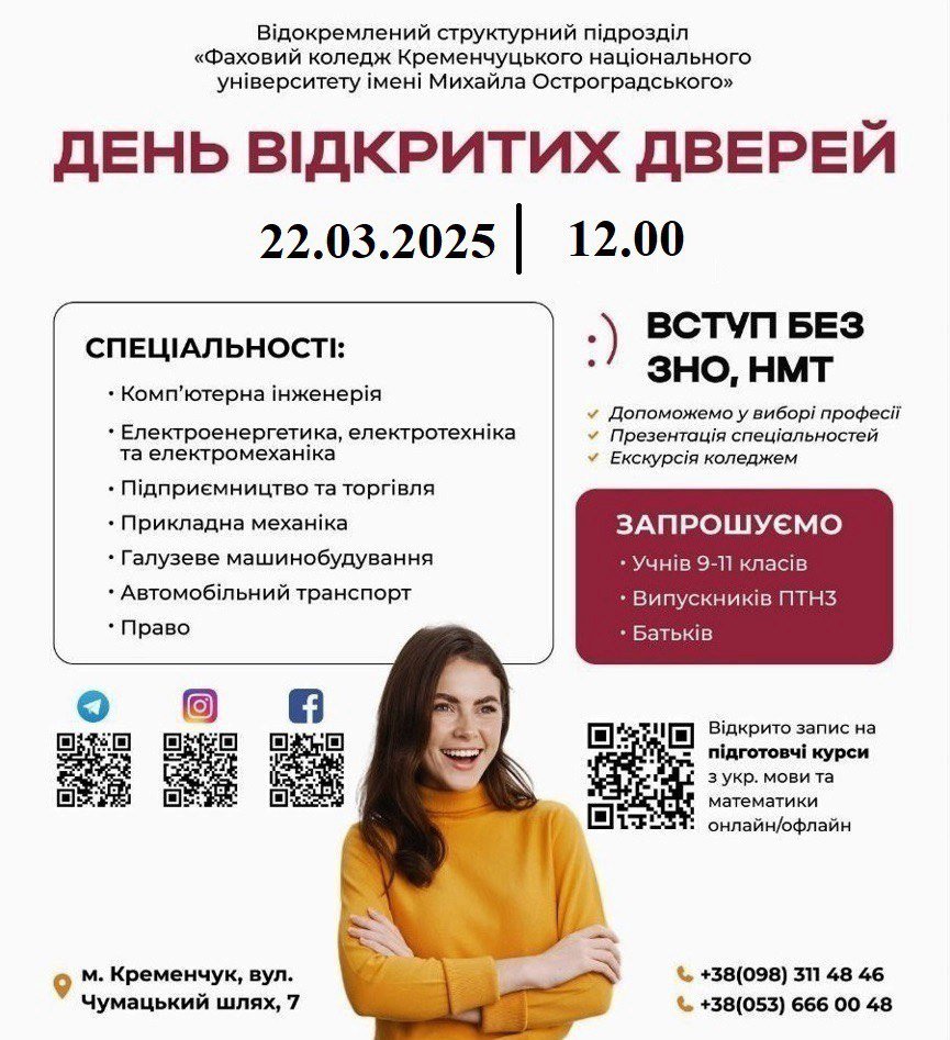 Обираєте фах та якісну освіту? ВСП Фаховий коледж КрНУ імені М. Остроградського — ваш старт до успішної кар’єри! Коледж КрНУ — це 80 років досвіду, понад тисяча студентів, потрібні роботодавцям випускники. Коледж пропонує вісім сучасних освітніх програм, що відповідають вимогам ринку праці. Обирайте напрямок, який розкриє ваш потенціал.