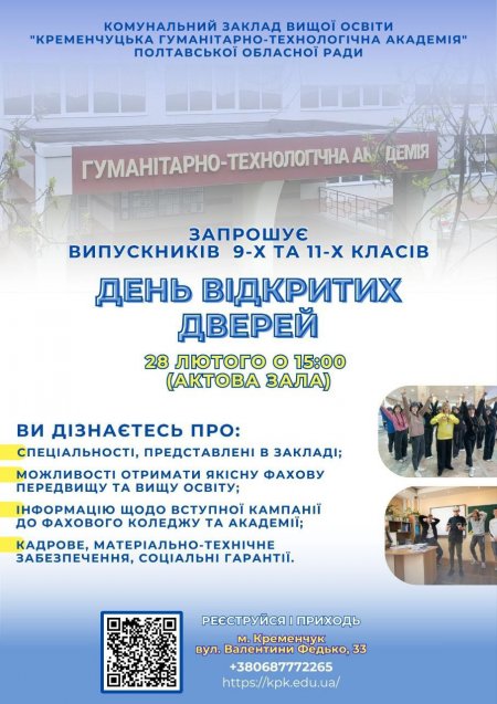 Кременчуцька гуманітарно-технологічна академія пропонує для випускників 11-х класів, ПТУ та коледжів навчання за спеціальностями: